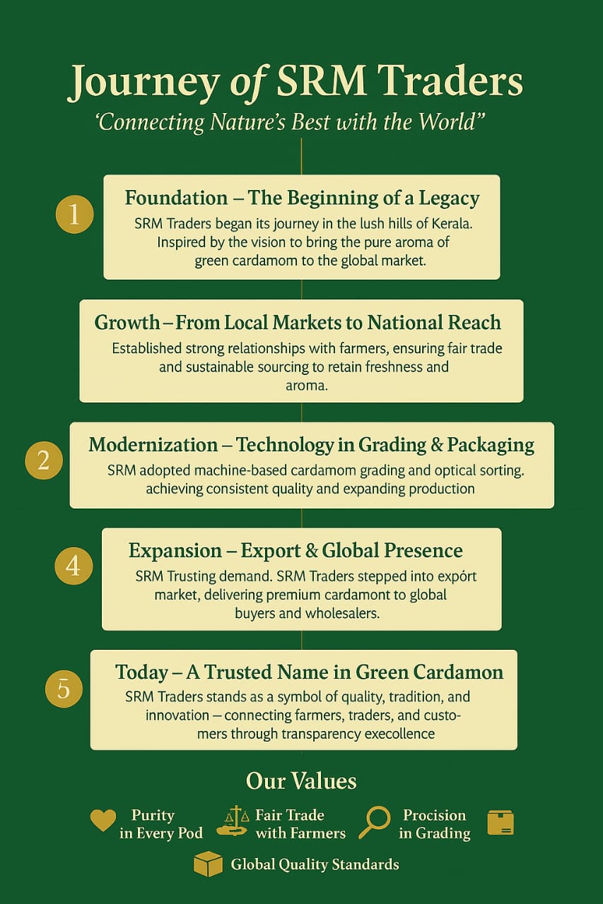At SRM Traders, our journey is one of heritage, hard work, and honesty — a story that began in the verdant hills of the Western Ghats, where the air is filled with the fragrance of fresh cardamom and pepper.